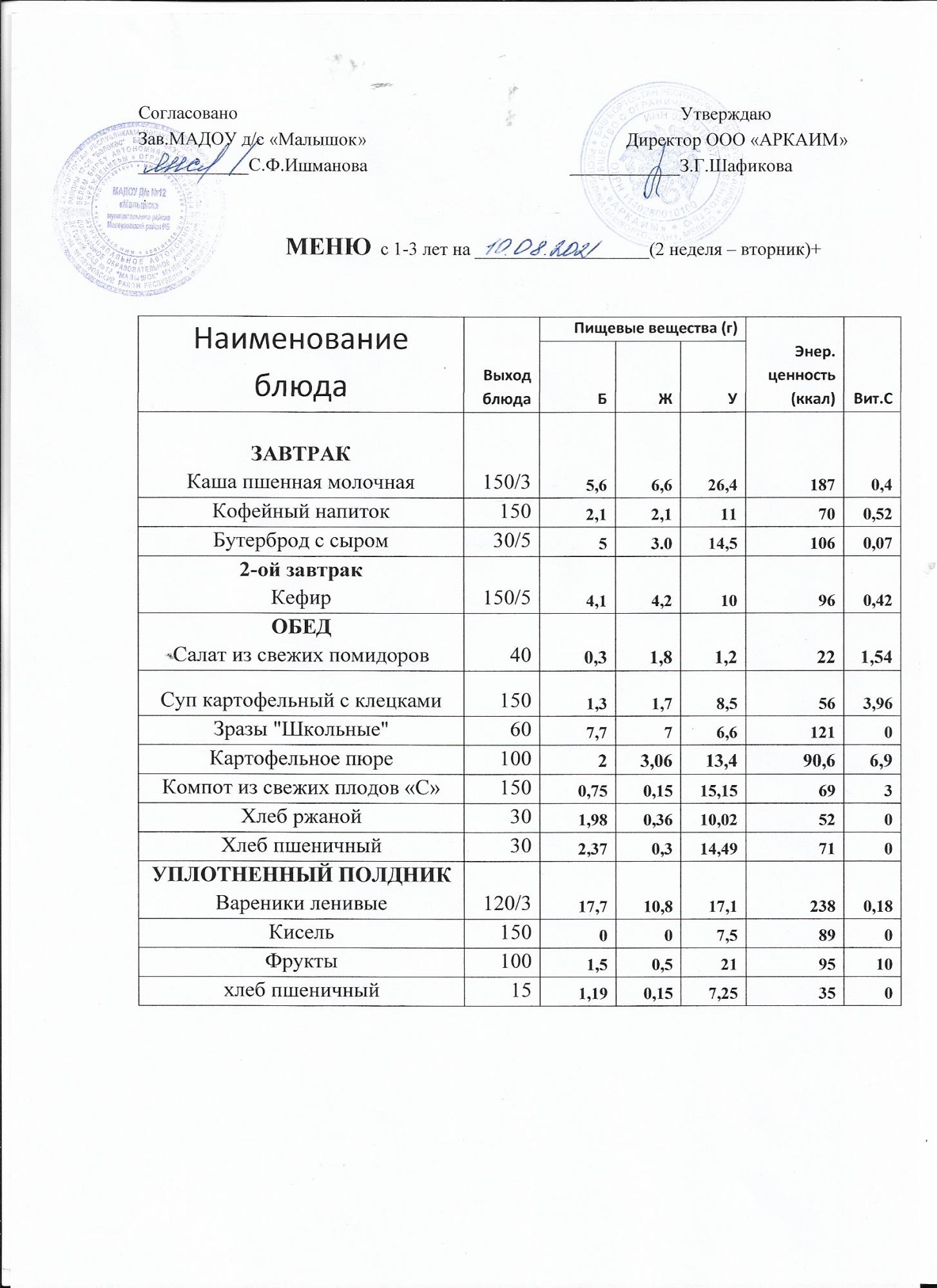 (Меню на 10 .08.2021г)